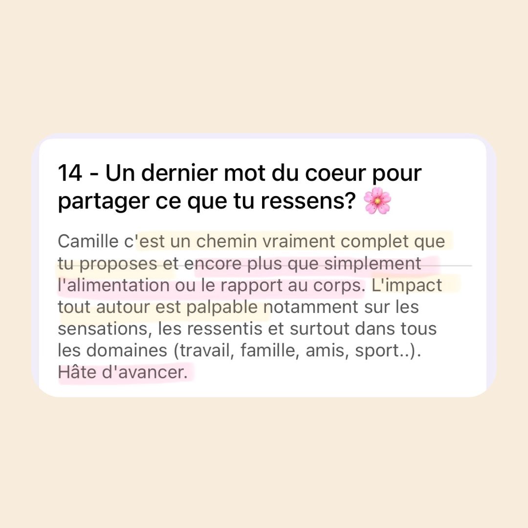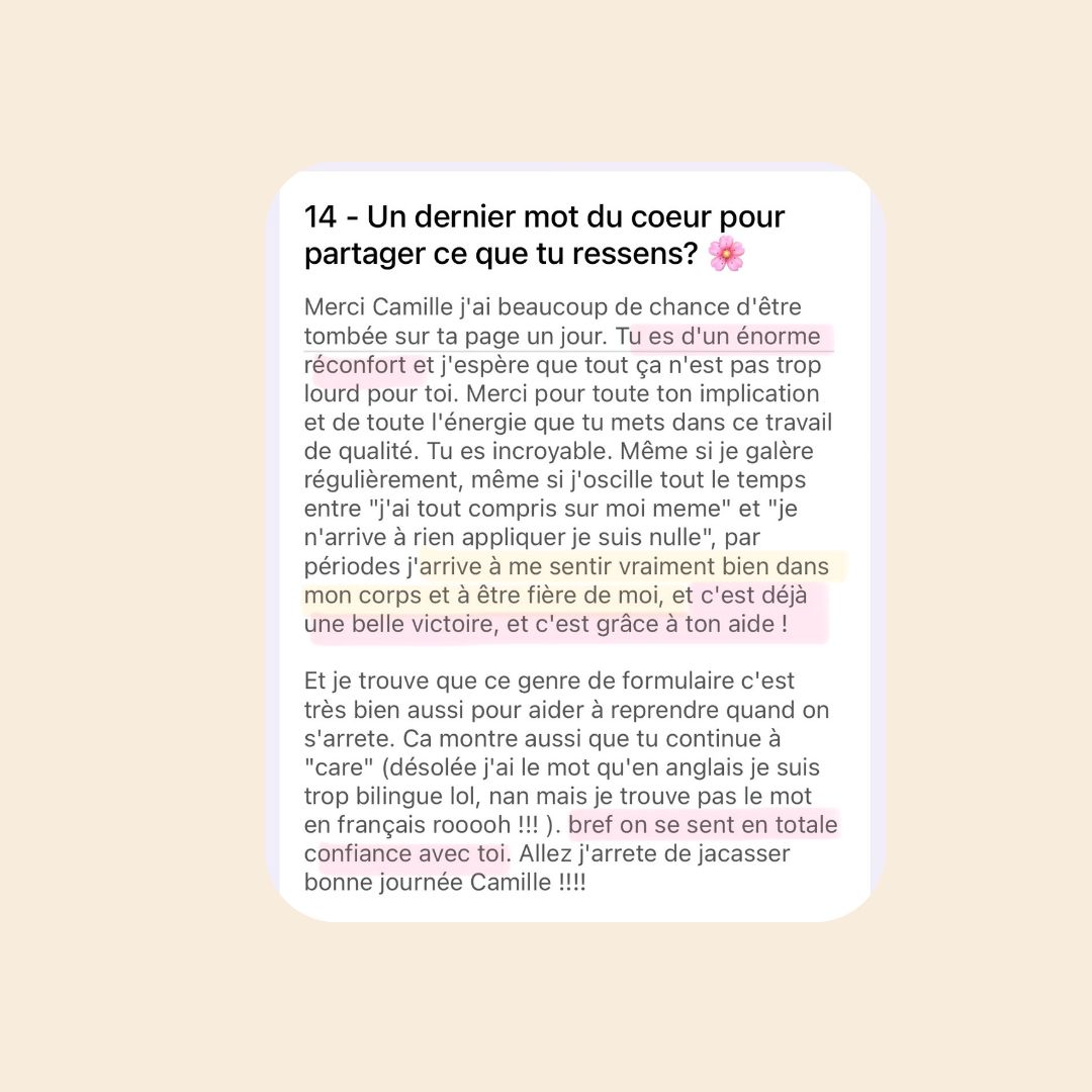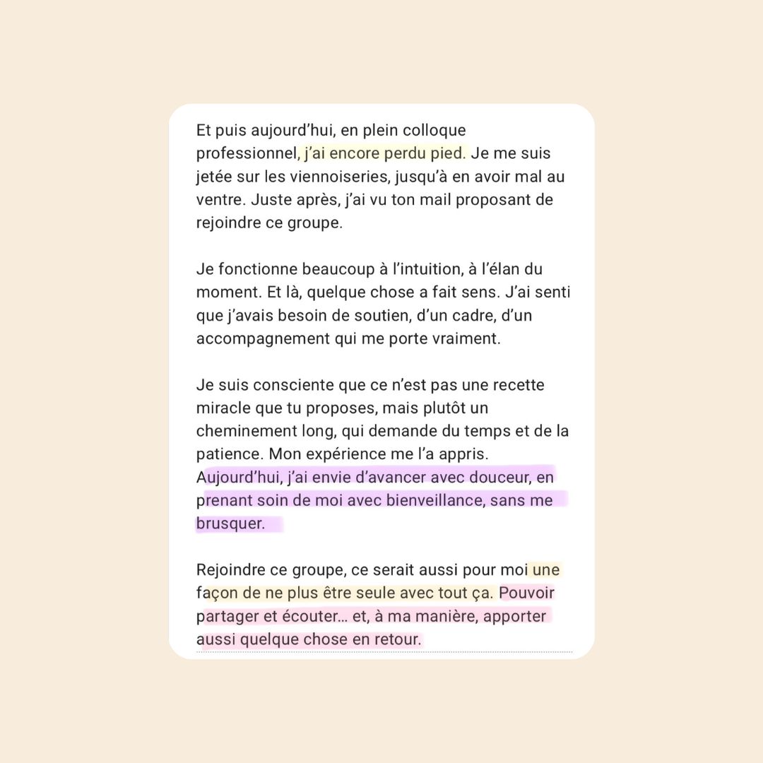 ⚠️ Important : Il ne remplace jamais un suivi médical ou psychothérapeutique. Il peut être un excellent complément pour travailler la relation au corps, à l’alimentation, et aux émotions. Si tu es dans une période aiguë, il est essentiel d’être suivi.e par un professionnel de santé.