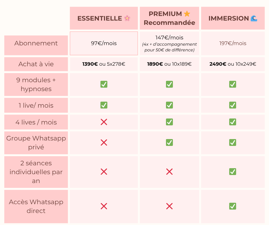 🌸 Essentielle 97€/mois → one-shot 1390€ : Pour toi si tu veux avancer en autonomie